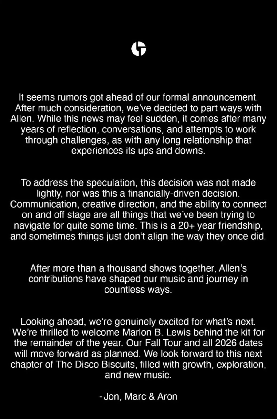 The Disco Biscuits have posted a statement confirming that they have parted ways with drummer Allen Aucoin. Rumors began circulating that the drummer had split from the band late last week, leading to widespread speculation on various fan forums throughout the weekend.
