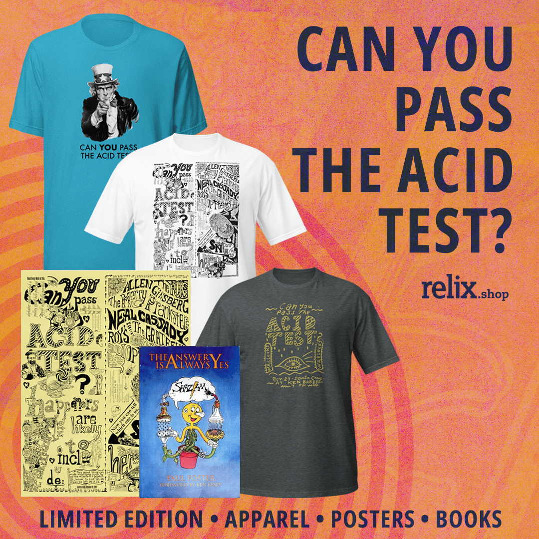 Explore apparel, posters, and books inspired by the Merry Pranksters’ psychedelic art: limited designs celebrating Kesey, Cassady & the Acid Tests. This collection features Paul Foster’s rare memoir: The Answer Is Always Yes. With just 945 copies originally distributed, it’s one of the rarest memoirs of the ‘60s counterculture.