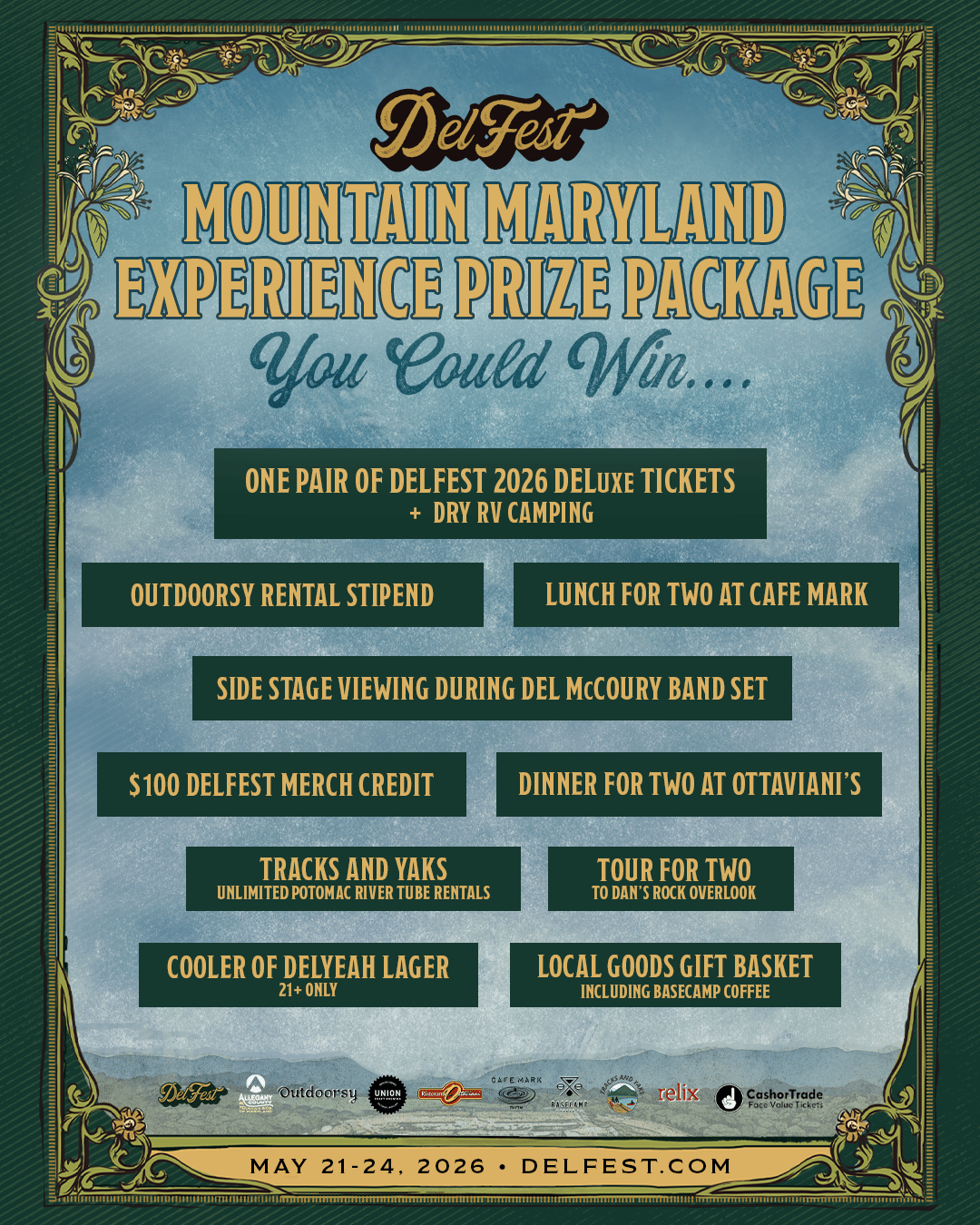 Your Mountain Maryland getaway weekend starts NOW! Here's your chance to have a DelFest experience like none other. In addition to a pair of weekend DELuxe tickets and a rental stipend from Outdoorsy, you'll have a shot to take home the grand prize featuring a VIP DelFest weekend and a grab bag of some of Allegany County's best offerings.